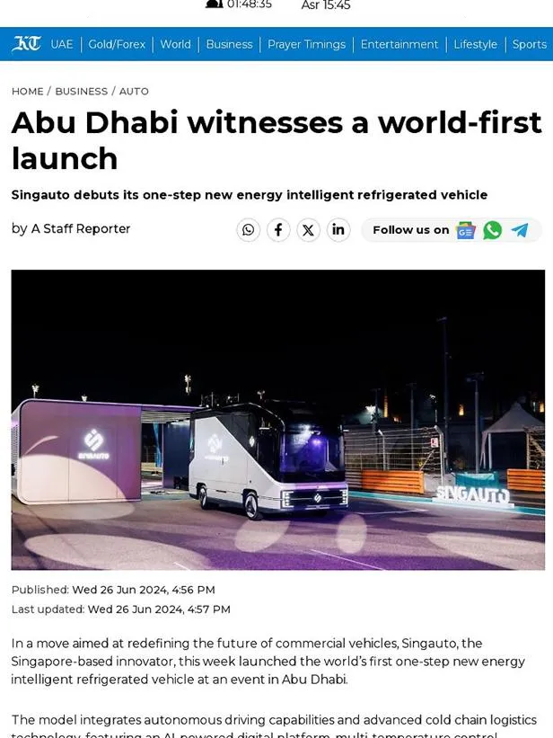 “THE NATIONAL”, the most influential official media in the Middle East, conducted an in-depth interview in half a page, which reflects the high attention SINGAUTO has received as a rising star in the industry. China’s top TV media CGTN not only conducted an exclusive interview, but also broadcast a 1 minute and 40 second news clip in its The World Today column, highlighting the brand’s prominent position in international communication.